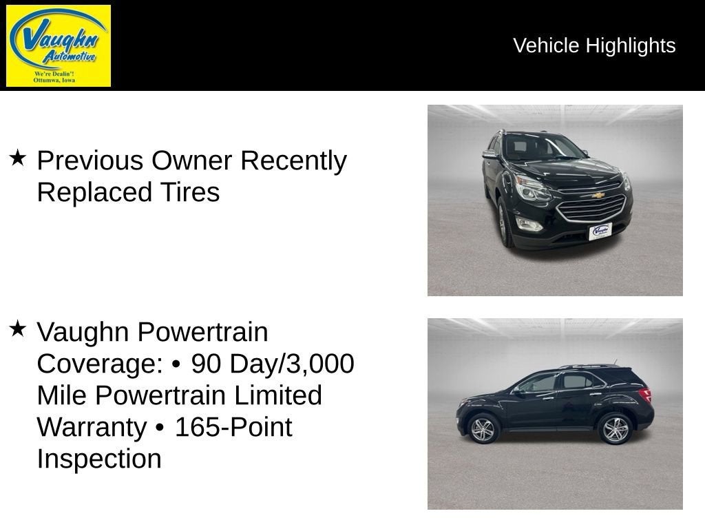 Previous Owner Recently Replaced Tires, Vaughn Powertrain Coverage: • 90 Day/3,000 Mile Powertrain Limited Warranty • 165-Point Inspection, 6-Speed Automatic with Overdrive, FWD, Saddle Up/Jet Black Leather, 8-Way Power Front Passenger Seat Adjuster, Alloy wheels, Automatic temperature control, Brake assist, Driver Confidence Package, Electronic Stability Control, Emergency communication system: OnStar Guidance, Enhanced Convenience Package, Exterior Parking Camera Rear, Fully automatic headlights, Heated Driver & Front Passenger Seats, Memory seat, Power Programmable Rear Liftgate, Radio: Chevrolet MyLink Audio System, Rear Cross-Traffic Alert, Rear Park Assist, Security system, Side Blind Zone Alert, SiriusXM Satellite Radio, Universal Home Remote. 2.4L 4-Cylinder SIDI DOHC VVT Mosaic Black Metallic 2017 Chevrolet Equinox Premier Priced below KBB Fair Purchase Price! 21/31 City/Highway MPG