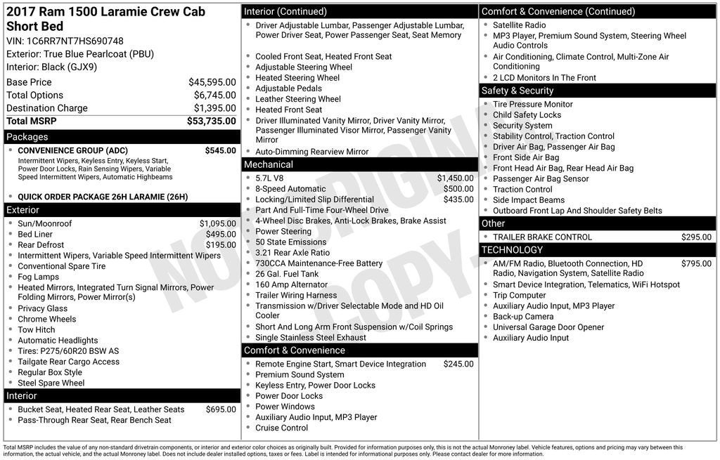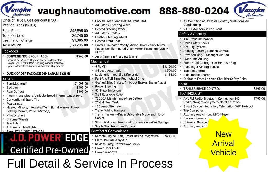 Certified. Dealer Inspection Completed, A copy of the vehicle inspection is available upon request, Vehicle Detailed Inside and Out, Recent Oil Change Completed, New Wiper Blades Installed, Backup Camera, 1500 Laramie, HEMI 5.7L V8 Multi Displacement VVT, 8-Speed Automatic, 4WD, True Blue Pearlcoat, Black Leather, 1 Yr. Trial (Registration Required), 115V Auxiliary Power Outlet, 4-Wheel Disc Brakes, 5-Year SiriusXM Traffic Service, 8.4 Touchscreen Display, ABS brakes, AM/FM radio, Auto High Beam Headlamp Control, Automatic temperature control, Bucket Seats, Convenience Group, Dual front impact airbags, Dual front side impact airbags, Electronic Stability Control, Folding Flat Load Floor Storage, Front anti-roll bar, Front Center Armrest w/Storage, Front dual zone A/C, Front fog lights, Front reading lights, Full Length Upgraded Floor Console, Fully automatic headlights, Garage door transmitter, GPS Navigation, HD Radio, Heated Front Seats, Heated Second Row Seats, Heated Steering Wheel, High Back Seats, Integrated Voice Command w/Bluetooth®, Keyless Enter-N-Go, Leather steering wheel, Leather Trimmed Bucket Seats, Memory seat, Occupant sensing airbag, Overhead airbag, Overhead console, ParkView Rear Back-Up Camera, Power 10-Way Memory Driver & 6-Way Passenger Seats, Power Sunroof, Quick Order Package 26H Laramie, Radio: Uconnect 3C Nav w/8.4 Display, Rain Sensitive Windshield Wipers, Rear 60/40 Split Folding Seat, Rear anti-roll bar, Rear Window Defroster, Remote Proximity Keyless Entry, Remote Start System, Security system, SIRIUSXM Satellite Radio, SIRIUSXM Traffic, SiriusXM Travel Link, Speed control, Tilt steering wheel, Traction control, Uconnect Access, Uconnect Access 1 Year Trial, Ventilated front seats. HEMI 5.7L V8 Multi Displacement VVT True Blue Pearlcoat 2017 Ram 1500 Laramie Priced below KBB Fair Purchase Price! Odometer is 1838 miles below market average!