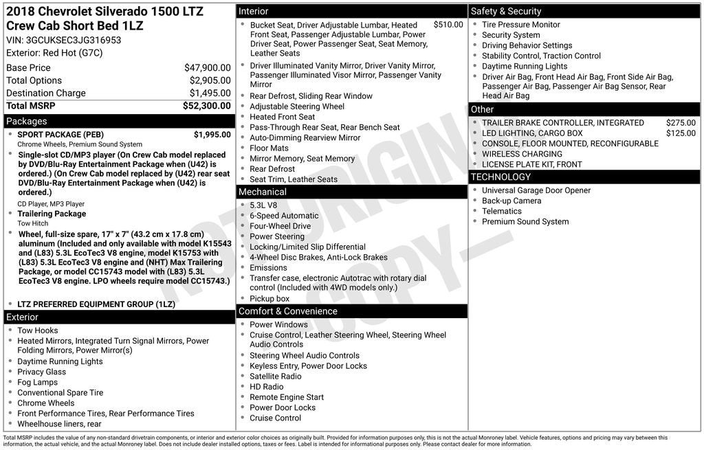Buy Online with Confidence. We Ship! No hidden fees, transparent no-haggle pricing, and vehicles market-priced daily at Vaughn Automotive.- Dealer Inspection- Recent Oil Change- New Wiper Blades- Vaughn Powertrain Coverage: 90 Day/3,000 Mile Powertrain Limited Warranty & 165-Point Inspection- SPORT PACKAGE- Seats, Front Full-Feature Leather-Appointed Bucket with Heated Seat Cushions and Seat Backs- Trailer Brake Controller, Integrated- LED Lighting, Cargo BoxVehicle DetailedThis 2018 Chevrolet Silverado 1500 LTZ 1LZ is an exceptional truck that combines rugged capability with premium comfort and convenience features. Powered by the reliable EcoTec3 5.3L V8 engine and equipped with 4-wheel drive, this Silverado is ready to tackle any job or adventure with ease.The exterior boasts a bold, red color that commands attention on the road. Inside, the luxurious leather-appointed seats provide exceptional comfort and support, while the Bose sound system and Chevrolet MyLink infotainment system keep you entertained and connected. The truck also features a host of advanced safety and technology features, including a rear-view camera, blind-spot monitoring, and a trailer brake controller for effortless towing.With its impressive towing capacity, spacious interior, and premium amenities, this Silverado is the perfect choice for those who demand the best in a full-size pickup. Whether you're hauling heavy loads, navigating rough terrain, or simply enjoying the open road, this truck will exceed your expectations.At Vaughn Automotive, we're committed to providing our customers with the highest level of service and satisfaction. Our team of experienced professionals will work with you to ensure that you find the perfect vehicle to meet your needs and budget. We invite you to come in and take this Silverado for a test drive – we're confident you'll be impressed by its capabilities and features.With Vaughn Best Deal Pricing, there is no arguing just a great deal. We make buying a vehicle fast, easy, and fun.Online price excludes $25 title fee, $15 electronic processing fee, $10 lien fee (if applicable), and a $180 Vaughn processing fee. Iowa buyers will pay Iowa use tax and license at delivery. Out-of-state buyers will pay their local tax, license, and applicable fees at delivery, plus a $165 out-of-state registration service fee. Vehicles are not available for sale to licensed dealers or vehicle resellers.Drive to Ottumwa and discover why customers have trusted our family since 1934.