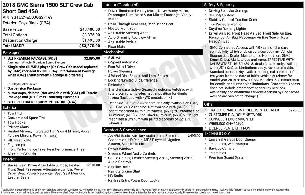 Dealer Inspection Completed, A copy of the vehicle inspection is available upon request, Vehicle Detailed Inside and Out, Recent Oil Change Completed, New Wiper Blades Installed, Remote Start, Vaughn Powertrain Coverage: • 90 Day/3,000 Mile Powertrain Limited Warranty • 165-Point Inspection, Has body damage priced accordingly, selling as is, Will need tires soon, selling as is, TPMS light is on, selling as is, Sierra 1500 SLT, EcoTec3 5.3L V8, 6-Speed Automatic Electronic with Overdrive, 4WD, Black Leather, 10-Way Power Driver's Seat Adjuster, 110-Volt AC Power Outlet, 20 x 9 Polished Aluminum Wheels, 3.42 Rear Axle Ratio, 4-Wheel Disc Brakes, 4.2 Diagonal Color Display Driver Info Center, 6-Speaker Audio System, 6 Rectangular Chromed Tubular Assist Steps, ABS brakes, Adjustable pedals, AM/FM radio: SiriusXM, Auto-dimming door mirrors, Auto-Dimming Inside Rear-View Mirror, Automatic temperature control, Bose Speaker System, Dual front impact airbags, Dual front side impact airbags, Dual-Zone Automatic Climate Control, Electronic Stability Control, Exterior Parking Camera Rear, EZ Lift & Lower Tailgate, Front anti-roll bar, Front Center Armrest w/Storage, Front fog lights, Fully automatic headlights, Garage door transmitter, GMC 4G LTE, GMC Connected Access, HD Radio, Heated Driver & Front Passenger Seats, Integrated Trailer Brake Controller, Leather Appointed Seat Trim, Memory seat, Occupant sensing airbag, OnStar & GMC Connected Services Capable, Outside temperature display, Overhead airbag, Overhead console, Premium audio system: GMC Infotainment System, Radio: AM/FM/GMC Infotainment System, Rear 60/40 Folding Bench Seat (Folds Up), Rear Wheelhouse Liners, Rear window defroster, Remote Locking Tailgate, Remote Vehicle Starter System, Security system, SiriusXM Satellite Radio, SLT Premium Package, Steering Wheel Audio Controls, Telescoping steering wheel, Thin Profile LED Fog Lamps, Tilt steering wheel, Traction control, Turn signal indicator mirrors, Universal Home Remote, Wireless Charging. EcoTec3 5.3L V8 Onyx Black 2018 GMC Sierra 1500 SLT Priced below KBB Fair Purchase Price!