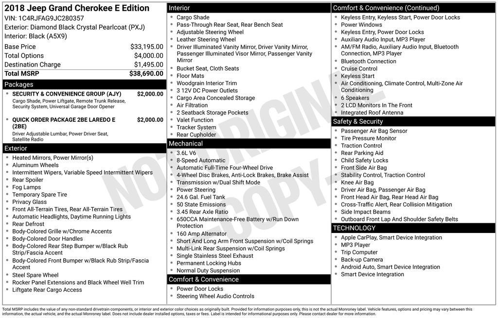 BUY ONLINE, WE SHIP!!! NO HIDDEN COSTS, NO HAGGLE PRICING, & OUR VEHICLES ARE MARKET PRICED DAILY AT VAUGHN AUTOMOTIVE.Certified. Dealer Inspection Completed, A copy of the vehicle inspection is available upon request, Vehicle Detailed Inside and Out, Recent Oil Change Completed, New Wiper Blades Installed, Remote Start, 8-Speed Automatic, 4WD, Black Cloth, 115V Auxiliary Power Outlet, 6 Speakers, ABS brakes, Anti-whiplash front head restraints, Apple CarPlay/Android Auto, Automatic temperature control, Bright Side Roof Rails, Dual front impact airbags, Dual front side impact airbags, Electronic Stability Control, Front dual zone A/C, Front fog lights, Fully automatic headlights, Heated door mirrors, Integrated Voice Command w/Bluetooth®, Knee airbag, Low tire pressure warning, Occupant sensing airbag, Overhead airbag, Overhead console, Panic alarm, ParkView Rear Back-Up Camera, Power 4-Way Driver Lumbar Adjust, Power 8-Way Driver/Manual Passenger Seat, Power door mirrors, Power Liftgate, Quick Order Package 2BE Laredo E, Radio: Uconnect 4 w/7 Display, Security & Convenience Group, Security Alarm, SiriusXM Satellite Radio, Speed control, Speed-Sensitive Wipers, Split folding rear seat, Steering Wheel Mounted Audio Controls, Telescoping steering wheel, Tilt steering wheel, Traction control, Universal Garage Door Opener, USB Host Flip, Wheels: 17 x 8.0 Silver Aluminum. 3.6L V6 24V VVT Diamond Black Crystal Pearlcoat 2018 Jeep Grand Cherokee Laredo Odometer is 5727 miles below market average!Certification Program Details: J.D. Power Edge Certified Pre-Owned: • 90 Day/3,000 Mile Limited Warranty with Platinum (The Best) Coverage • 165-Point Inspection o Vehicle History Report o Full Road Test o Tire & Brakes o Transmission o Engine Components o Electrical Components • 24-Hour Roadside Assistance & Towing (1 Year) • Rental car reimbursement • Lodging assistance • Extend coverage options availableAwards:* 2018 KBB.com 10 Most Awarded Brands Our Vaughn Best Deal Pricing skips the arguing and you get a great deal. Plus it makes buying a car fast and fun! Online Price excludes $25 title, $15 electronic processing, $10 lien Fee (if applicable), and $180 Vaughn processing fee. Iowa buyers will pay Iowa Use Tax & License at delivery. Out of state buyers will pay their local tax, license, and other fees at delivery plus $165 out-of-state registration service fee. Vehicle not available for sale to other licensed dealers or vehicle resellers. Drive to Ottumwa and find out why people have been buying their vehicles from our family since 1934.http://www.realdeal.com/