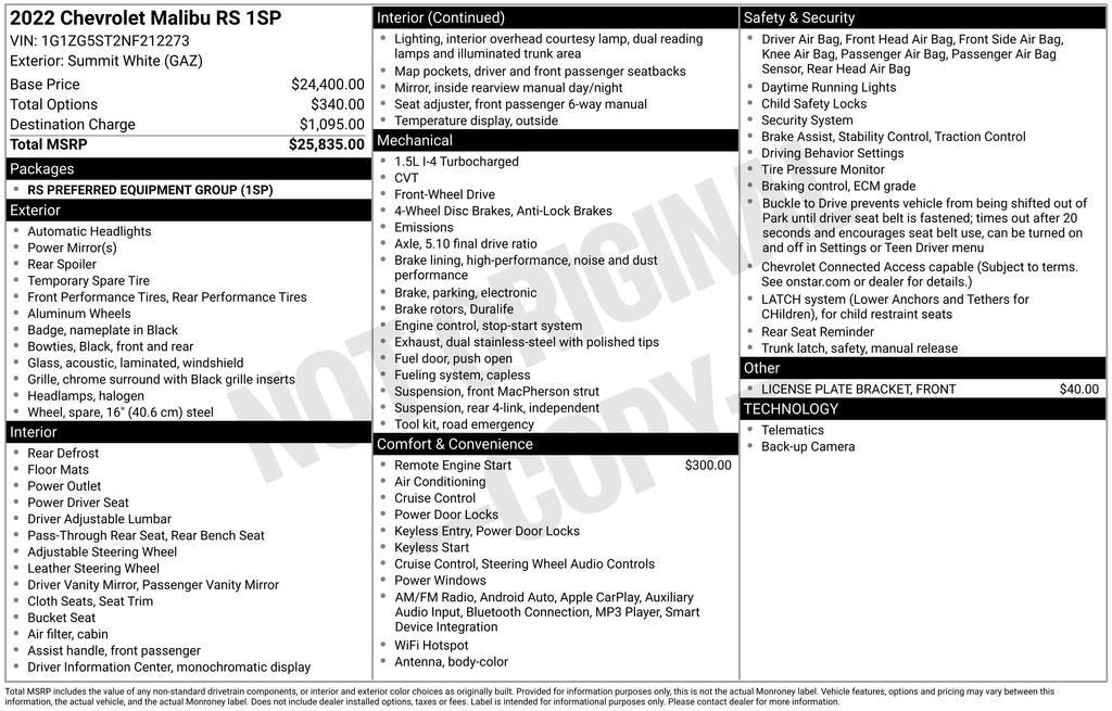 BUY ONLINE, WE SHIP!!! NO HIDDEN COSTS, NO HAGGLE PRICING, & OUR VEHICLES ARE MARKET PRICED DAILY AT VAUGHN AUTOMOTIVE.Certified. 1-Owner, Dealer Inspection Completed, A copy of the vehicle inspection is available upon request, Vehicle Detailed Inside and Out, Recent Oil Change Completed, New Wiper Blades Installed, 4 New Tires, CVT, FWD, Jet Black Cloth, 18 Aluminum Wheels, 6-Speaker Audio System Feature, 8-Way Power Driver Seat Adjuster, ABS brakes, Air Conditioning, Dual front impact airbags, Dual front side impact airbags, Electronic Stability Control, Emergency communication system: OnStar and Chevrolet connected services capable, Exterior Parking Camera Rear, Fully automatic headlights, Knee airbag, Low tire pressure warning, Occupant sensing airbag, Overhead airbag, Overhead console, Power door mirrors, Power Driver Lumbar Control Seat Adjuster, Premium audio system: Chevrolet Infotainment 3, Radio: Chevrolet Infotainment 3 System, Rear anti-roll bar, Rear side impact airbag, Rear window defroster, Remote Vehicle Starter System, Security system, Speed control, Split folding rear seat, Steering wheel mounted audio controls, Telescoping steering wheel, Tilt steering wheel, Traction control, Wireless Apple CarPlay/Android Auto. 1.5L DOHC Summit White 2022 Chevrolet Malibu RS 29/36 City/Highway MPGCertification Program Details: J.D. Power Edge Certified Pre-Owned: • 90 Day/3,000 Mile Limited Warranty with Platinum (The Best) Coverage • 165-Point Inspection o Vehicle History Report o Full Road Test o Tire & Brakes o Transmission o Engine Components o Electrical Components • 24-Hour Roadside Assistance & Towing (1 Year) • Rental car reimbursement • Lodging assistance • Extend coverage options availableOur Vaughn Best Deal Pricing skips the arguing and you get a great deal. Plus it makes buying a car fast and fun! Online Price excludes $25 title, $15 electronic processing, $10 lien Fee (if applicable), and $180 Vaughn processing fee. Iowa buyers will pay Iowa Use Tax & License at delivery. Out of state buyers will pay their local tax, license, and other fees at delivery plus $165 out-of-state registration service fee. Vehicle not available for sale to other licensed dealers or vehicle resellers. Drive to Ottumwa and find out why people have been buying their vehicles from our family since 1934.http://www.realdeal.com/rp6tn