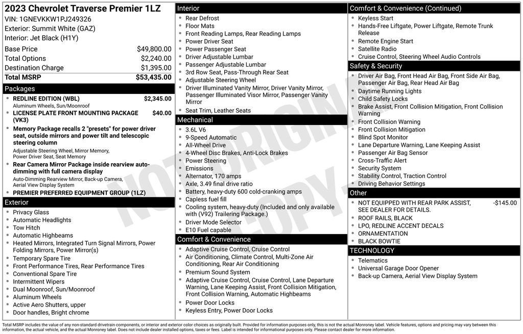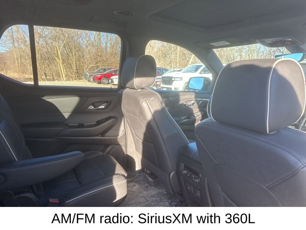 BUY ONLINE, WE SHIP!!! NO HIDDEN COSTS, NO HAGGLE PRICING, & OUR VEHICLES ARE MARKET PRICED DAILY AT VAUGHN AUTOMOTIVE.Certified. 1-Owner, Dealer Inspection Completed, A copy of the vehicle inspection is available upon request, Vehicle Detailed Inside and Out, Recent Oil Change Completed, New Wiper Blades Installed, Remote Start, Traverse Premier, 3.6L V6 SIDI VVT, 9-Speed Automatic, AWD, Summit White, Jet Black Leather, 3.49 Axle Ratio, 4-Wheel Disc Brakes, 6-Way Power Front Passenger Seat, 8-Way Power Driver Seat Adjuster, ABS brakes, AM/FM radio: SiriusXM with 360L, Apple CarPlay/Android Auto, Auto High-beam Headlights, Automatic temperature control, Black Bowtie, Black Door Handles, Black Roof Rails, Bose Premium 10-Speaker Audio System Feature, Dual front impact airbags, Dual front side impact airbags, Dual SkyScape 2-Panel Power Sunroof, Electronic Stability Control, Emergency communication system, Front anti-roll bar, Front Center Armrest, Front dual zone A/C, Fully automatic headlights, Garage door transmitter, Heated 2nd Row Outboard Position Seats, Heated Driver & Front Passenger Seats, Heated steering wheel, Memory seat, Occupant sensing airbag, Ornamentation, Overhead airbag, Overhead console, Power Liftgate, Premium audio system: Chevrolet Infotainment 3 Plus, Rear window defroster, Redline Accent Decals (LPO), Redline Edition, Security system, Steering wheel mounted audio controls, Telescoping steering wheel, Traction control, Ventilated Driver & Front Passenger Seats, Wheels: 20 Gloss Black Painted Alum w/Red Stripes. 3.6L V6 SIDI VVT Summit White 2023 Chevrolet Traverse PremierCertification Program Details: J.D. Power Edge Certified Pre-Owned: • 90 Day/3,000 Mile Limited Warranty with Platinum (The Best) Coverage • 165-Point Inspection o Vehicle History Report o Full Road Test o Tire & Brakes o Transmission o Engine Components o Electrical Components • 24-Hour Roadside Assistance & Towing (1 Year) • Rental car reimbursement • Lodging assistance • Extend coverage options availableOur Vaughn Best Deal Pricing skips the arguing and you get a great deal. Plus it makes buying a car fast and fun! Online Price excludes $25 title, $15 electronic processing, $10 lien Fee (if applicable), and $180 Vaughn processing fee. Iowa buyers will pay Iowa Use Tax & License at delivery. Out of state buyers will pay their local tax, license, and other fees at delivery plus $165 out-of-state registration service fee. Vehicle not available for sale to other licensed dealers or vehicle resellers. Drive to Ottumwa and find out why people have been buying their vehicles from our family since 1934.http://www.realdeal.com/