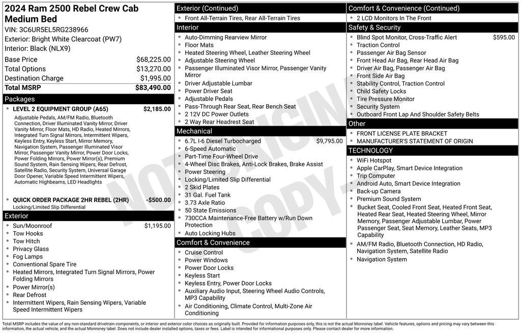 This 2024 Ram 2500 Rebel is a true workhorse, built to handle any task you throw its way. Under the hood, you'll find the legendary Cummins 6.7L I6 Turbodiesel engine, mated to a smooth-shifting 6-speed automatic transmission and a capable 4WD system. With 15,080 miles on the odometer, this truck is still young and ready to take on your toughest jobs.