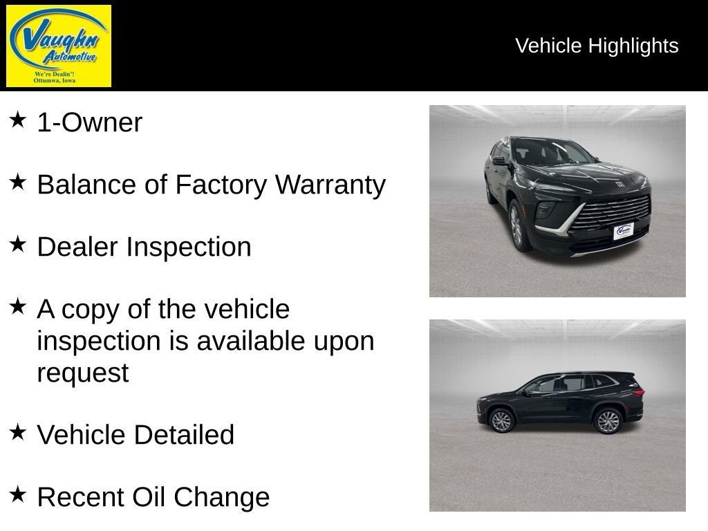 BUY ONLINE, WE SHIP!!! NO HIDDEN COSTS, NO HAGGLE PRICING, & OUR VEHICLES ARE MARKET PRICED DAILY AT VAUGHN AUTOMOTIVE.1-Owner, Balance of Factory Warranty, Dealer Inspection Completed, A copy of the vehicle inspection is available upon request, Vehicle Detailed Inside and Out, Recent Oil Change Completed, New Wiper Blades Installed, Remote Start, Factory Warranty: • Balance of remaining bumper to bumper factory warranty •, 8-Speed Automatic, AWD, Ebony Seats With Sky Gray Ebony Interior Premium Synthetic, 3rd row seats: split-bench, ABS brakes, Auto High-beam Headlights, Auto-dimming door mirrors, Auto-dimming Rear-View mirror, Automatic temperature control, Bose Premium 12-Speaker Audio System, Driver 4-Way Power Lumbar Seat Adjuster, Driver 8-Way Power Seat Adjuster, Dual front impact airbags, Dual front side impact airbags, Electronic Stability Control, Emergency communication system: OnStar and Buick connected services capable, Front dual zone A/C, Front Passenger 4-Way Power Lumbar Seat Adjuster, Front Passenger 6-Way Power Seat Adjuster, Fully automatic headlights, Heated door mirrors, Heated Driver and Front Passenger Seats, Heated steering wheel, Low tire pressure warning, Navigation System, Occupant sensing airbag, Overhead airbag, Overhead console, Power door mirrors, Power driver seat, Power Liftgate, Power passenger seat, Premium audio system: Buick Infotainment System, Rear air conditioning, Rear side impact airbag, Security system, SiriusXM with 360L Trial Subscription, Speed control, Steering wheel mounted audio controls, Telescoping steering wheel, Tilt steering wheel, Traction control, Turn signal indicator mirrors, Wheels: 20 Alloy with Medium Android Finish, Wireless Apple CarPlay, Wireless Google Android Auto. 2.5L DOHC Ebony Twilight Metallic 2025 Buick Enclave Preferred Priced below KBB Fair Purchase Price! Odometer is 6930 miles below market average!Our Vaughn Best Deal Pricing skips the arguing and you get a great deal. Plus it makes buying a car fast and fun! Online Price excludes $25 title, $15 electronic processing, $10 lien Fee (if applicable), and $180 Vaughn processing fee. Iowa buyers will pay Iowa Use Tax & License at delivery. Out of state buyers will pay their local tax, license, and other fees at delivery plus $165 out-of-state registration service fee. Vehicle not available for sale to other licensed dealers or vehicle resellers. Drive to Ottumwa and find out why people have been buying their vehicles from our family since 1934.http://www.realdeal.com/avsry